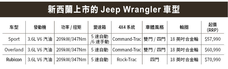 目前在新西蘭熱賣的三款車型包括:入門版Sport;偏重於城市的中配版Overland;硬派越野頂配版Rubicon。Sport和Overland均有雙門版和四門版可選,而Rubicon則只有四門版一種車體。