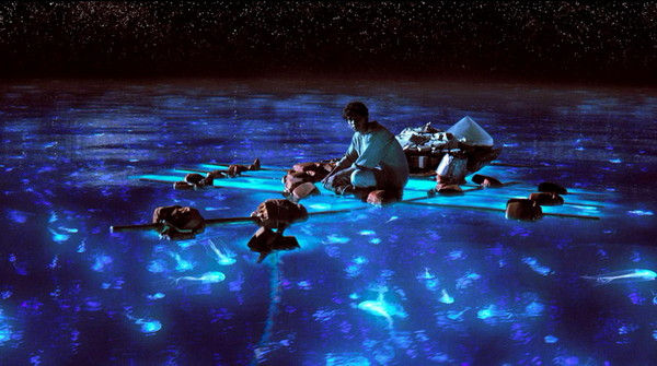 其實,這個難得一見的畫面還曾被導演李安記錄到了《少年Pi的奇幻漂流》(Life of Pi)裡。在少年派漂浮於茫茫大海上的一個夜晚,水中星星點點閃現出美麗的亮光,小船周圍尤其明顯。後來,主人翁攪動海水,那片水竟發出藍色的熒光,還有一條閃著藍光的大鯨魚躍出水面,讓少年派看呆了。