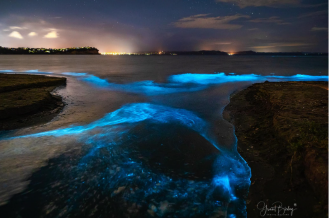 1月4號和5號晚,在奧克蘭北部旺阿帕勞阿半島(Whangaparaoa Peninsula)的大曼利海灘(Big Manly Beach),柔美的藍色熒光隨著海浪在水中翻滾,與天上的繁星遙相呼應,一動一靜,如夢如幻,彷彿讓人置身於仙境。藍色的熒光會在運動的水流中因其速度的變化而忽明忽暗,不斷變幻著色彩,這種神奇的現象經常令看到的人嘖嘖稱奇。