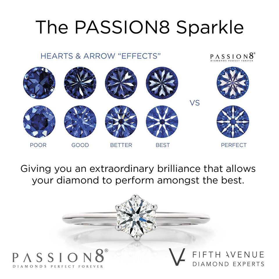 Passion8钻石经过严格挑选、完美切割。所有58个切面形状对称、切面抛光成无暇镜面,光线照在上面,从钻石顶反射出光谱的各种颜色,有非凡的火彩光影,由于切割角度的精确控制,所有折射光线都从钻石表面射出,制造出夺目的璀璨效果,一块passion8钻石比同等级的常规钻石看上去更白、更炫。